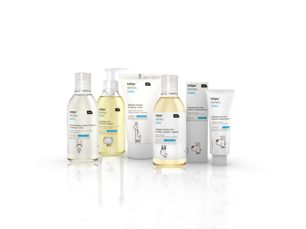 Grafika opakowań została mocna osadzona w ramach identyfikacji tołpa, tłumacząc na język dziecięcy komunikację marki głównej. Projekt odzwierciedla strategię komunikacji opakowaniowej kosmetyków dla najmłodszych, której głównym celem jest zbudowanie przyjemnego, emocjonalnego i pozamedycznego przekazu. Stąd rysunki budzących pozytywne emocje zwierzątek narysowanych na dziecięcą modłę przez Andrzeja Tylkowskiego oraz delikatna typografia i przyjazny dla oka kod kolorystyczny. Uwagę zwracają wyraźnie wyeksponowane komunikaty na frontach opakowań.